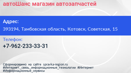 автоШанс, магазин автозапчастей по адресу 393194, Тамбовская область, Котовск, Советская, 15 в дальнейшем Организация, размещена в следующих категориях:
