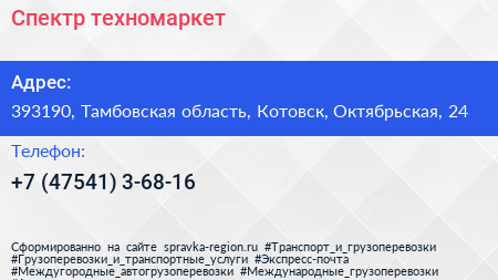 Спектр, техномаркет по адресу 393190, Тамбовская область, Котовск, Октябрьская, 24 в дальнейшем Организация, размещена в следующих категориях: