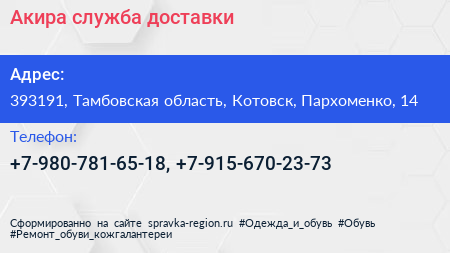 Акира, служба доставки по адресу 393191, Тамбовская область, Котовск, Пархоменко, 14 в дальнейшем Организация, размещена в следующих категориях: