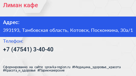 Лиман, кафе по адресу 393193, Тамбовская область, Котовск, Посконкина, 30а/1 в дальнейшем Организация, размещена в следующих категориях: