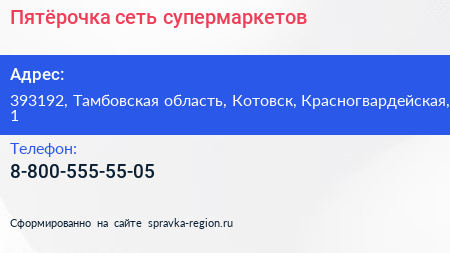 Пятёрочка, сеть супермаркетов по адресу 393192, Тамбовская область, Котовск, Красногвардейская, 1 в дальнейшем Организация, размещена в следующих категориях: