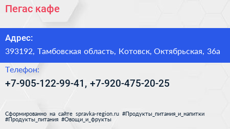 Пегас, кафе по адресу 393192, Тамбовская область, Котовск, Октябрьская, 36а в дальнейшем Организация, размещена в следующих категориях: