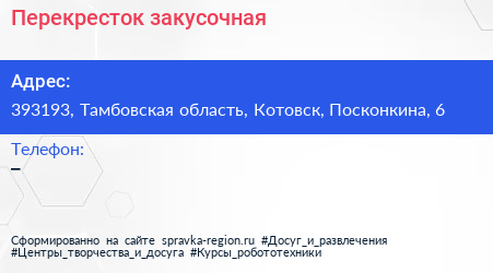 Перекресток, закусочная по адресу 393193, Тамбовская область, Котовск, Посконкина, 6 в дальнейшем Организация, размещена в следующих категориях: