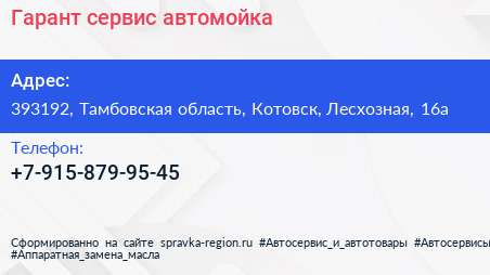 Гарант-сервис, автомойка по адресу 393192, Тамбовская область, Котовск, Лесхозная, 16а в дальнейшем Организация, размещена в следующих категориях: