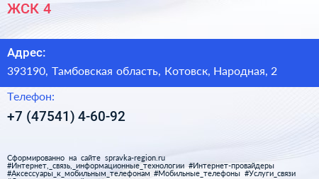 ЖСК №4 по адресу 393190, Тамбовская область, Котовск, Народная, 2 в дальнейшем Организация, размещена в следующих категориях: