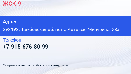 ЖСК №9 по адресу 393193, Тамбовская область, Котовск, Мичурина, 28а в дальнейшем Организация, размещена в следующих категориях: