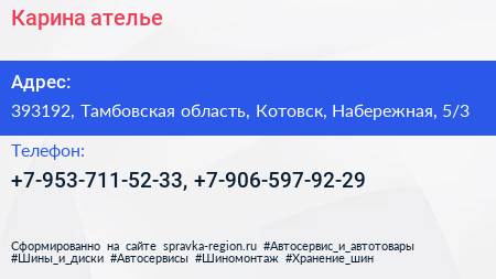 Карина, ателье по адресу 393192, Тамбовская область, Котовск, Набережная, 5/3 в дальнейшем Организация, размещена в следующих категориях: