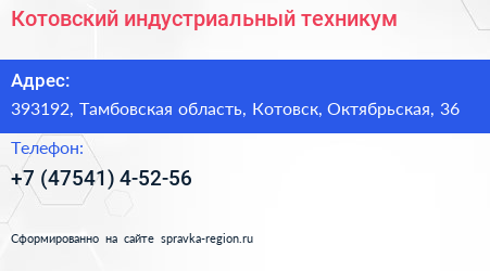Котовский индустриальный техникум по адресу 393192, Тамбовская область, Котовск, Октябрьская, 36 в дальнейшем Организация, размещена в следующих категориях: