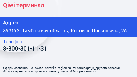 Qiwi, терминал по адресу 393193, Тамбовская область, Котовск, Посконкина, 26 в дальнейшем Организация, размещена в следующих категориях: