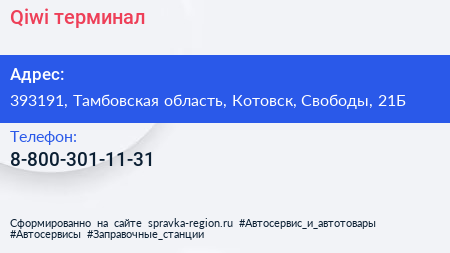 Qiwi, терминал по адресу 393191, Тамбовская область, Котовск, Свободы, 21Б в дальнейшем Организация, размещена в следующих категориях: