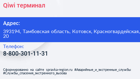 Qiwi, терминал по адресу 393194, Тамбовская область, Котовск, Красногвардейская, 20 в дальнейшем Организация, размещена в следующих категориях:
