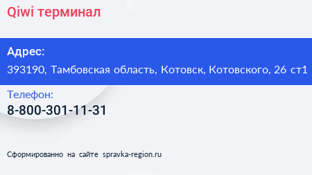 Qiwi, терминал по адресу 393190, Тамбовская область, Котовск, Котовского, 26 ст1 в дальнейшем Организация, размещена в следующих категориях: