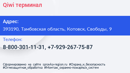Qiwi, терминал по адресу 393190, Тамбовская область, Котовск, Свободы, 9 в дальнейшем Организация, размещена в следующих категориях: