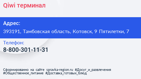 Qiwi, терминал по адресу 393191, Тамбовская область, Котовск, 9 Пятилетки, 7 в дальнейшем Организация, размещена в следующих категориях: