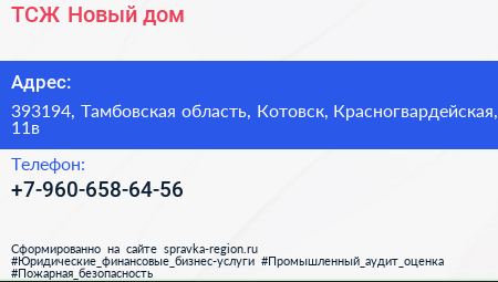 ТСЖ Новый дом по адресу 393194, Тамбовская область, Котовск, Красногвардейская, 11в в дальнейшем Организация, размещена в следующих категориях:
