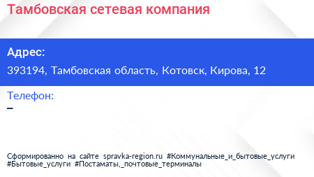 Тамбовская сетевая компания по адресу 393194, Тамбовская область, Котовск, Кирова, 12 в дальнейшем Организация, размещена в следующих категориях: