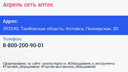 Апрель, сеть аптек по адресу 393190, Тамбовская область, Котовск, Пионерская, 20 в дальнейшем Организация, размещена в следующих категориях: