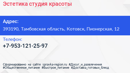 Эстетика, студия красоты по адресу 393190, Тамбовская область, Котовск, Пионерская, 12 в дальнейшем Организация, размещена в следующих категориях: