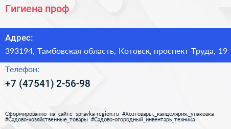 Гигиена проф по адресу 393194, Тамбовская область, Котовск, проспект Труда, 19 в дальнейшем Организация, размещена в следующих категориях: