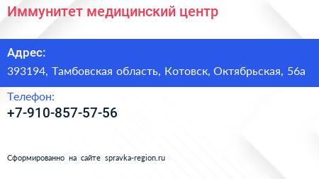 Иммунитет, медицинский центр по адресу 393194, Тамбовская область, Котовск, Октябрьская, 56а в дальнейшем Организация, размещена в следующих категориях:
