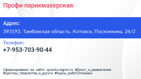 Профи, парикмахерская по адресу 393193, Тамбовская область, Котовск, Посконкина, 26/2 в дальнейшем Организация, размещена в следующих категориях: