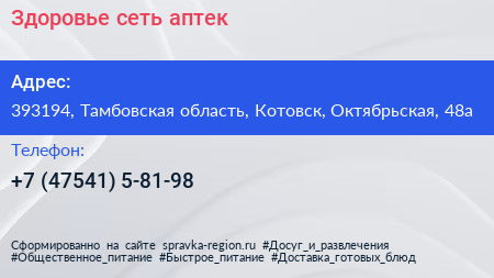 Здоровье, сеть аптек по адресу 393194, Тамбовская область, Котовск, Октябрьская, 48а в дальнейшем Организация, размещена в следующих категориях: