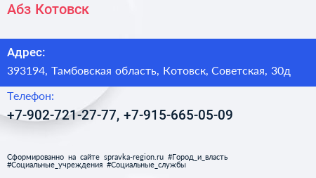 Абз-Котовск по адресу 393194, Тамбовская область, Котовск, Советская, 30д в дальнейшем Организация, размещена в следующих категориях: