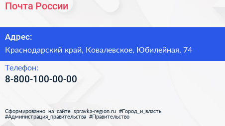 Почта России по адресу Краснодарский край, Ковалевское, Юбилейная, 74 в дальнейшем Организация, размещена в следующих категориях: