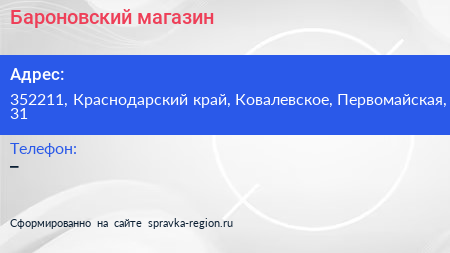 Бароновский, магазин по адресу 352211, Краснодарский край, Ковалевское, Первомайская, 31 в дальнейшем Организация, размещена в следующих категориях: