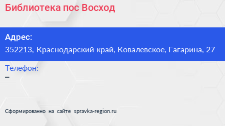 Библиотека, пос. Восход по адресу 352213, Краснодарский край, Ковалевское, Гагарина, 27 в дальнейшем Организация, размещена в следующих категориях: