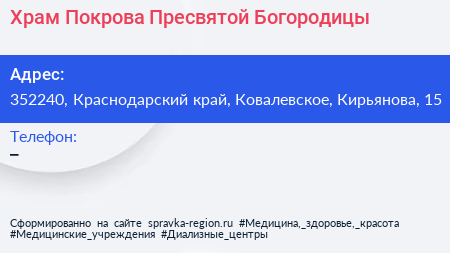 Храм Покрова Пресвятой Богородицы по адресу 352240, Краснодарский край, Ковалевское, Кирьянова, 15 в дальнейшем Организация, размещена в следующих категориях:
