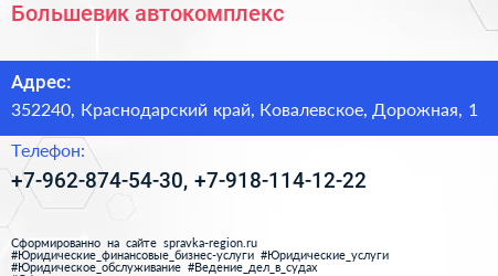 Большевик, автокомплекс по адресу 352240, Краснодарский край, Ковалевское, Дорожная, 1 в дальнейшем Организация, размещена в следующих категориях: