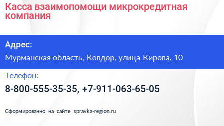 Касса взаимопомощи, микрокредитная компания по адресу Мурманская область, Ковдор, улица Кирова, 10 в дальнейшем Организация, размещена в следующих категориях: