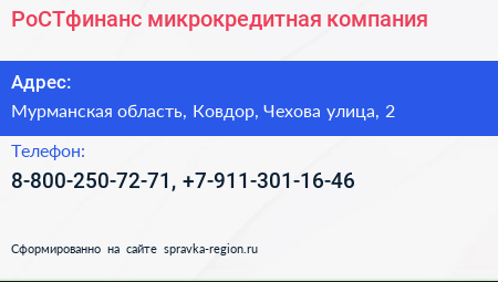 РоСТфинанс, микрокредитная компания по адресу Мурманская область, Ковдор, Чехова улица, 2 в дальнейшем Организация, размещена в следующих категориях: