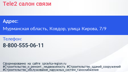 Tele2, салон связи по адресу Мурманская область, Ковдор, улица Кирова, 7/9 в дальнейшем Организация, размещена в следующих категориях: