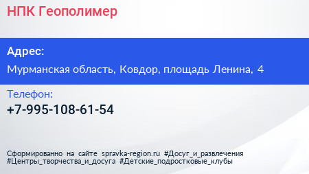 НПК Геополимер по адресу Мурманская область, Ковдор, площадь Ленина, 4 в дальнейшем Организация, размещена в следующих категориях: