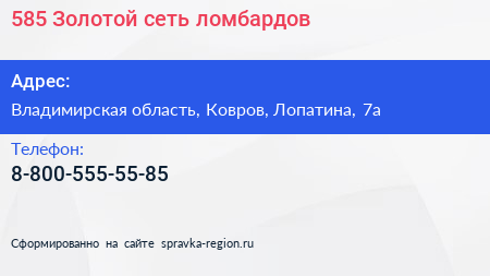 585*Золотой, сеть ломбардов по адресу Владимирская область, Ковров, Лопатина, 7а в дальнейшем Организация, размещена в следующих категориях: