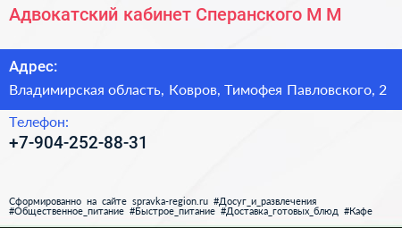 Адвокатский кабинет Сперанского М.М. по адресу Владимирская область, Ковров, Тимофея Павловского, 2 в дальнейшем Организация, размещена в следующих категориях: