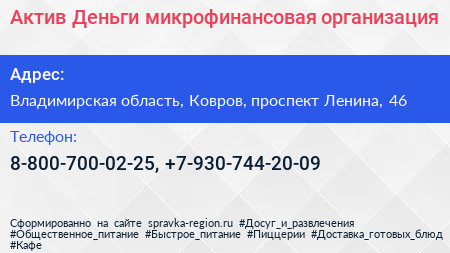 Актив Деньги, микрофинансовая организация по адресу Владимирская область, Ковров, проспект Ленина, 46 в дальнейшем Организация, размещена в следующих категориях: