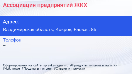 Ассоциация предприятий ЖКХ по адресу Владимирская область, Ковров, Еловая, 86 в дальнейшем Организация, размещена в следующих категориях:
