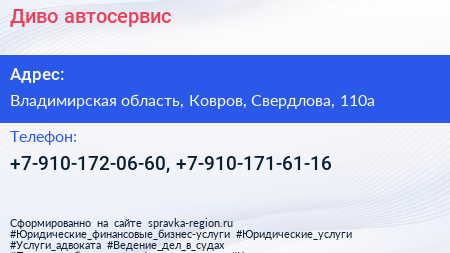 Диво, автосервис по адресу Владимирская область, Ковров, Свердлова, 110а в дальнейшем Организация, размещена в следующих категориях: