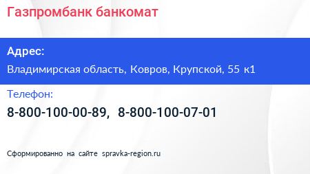 Газпромбанк, банкомат по адресу Владимирская область, Ковров, Крупской, 55 к1 в дальнейшем Организация, размещена в следующих категориях: