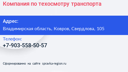 Компания по техосмотру транспорта по адресу Владимирская область, Ковров, Свердлова, 105 в дальнейшем Организация, размещена в следующих категориях: