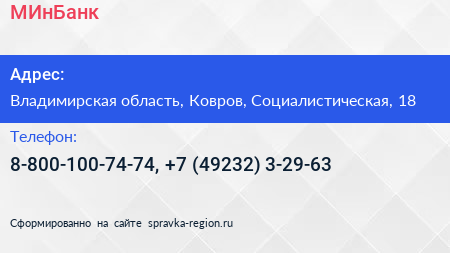 МИнБанк по адресу Владимирская область, Ковров, Социалистическая, 18 в дальнейшем Организация, размещена в следующих категориях:
