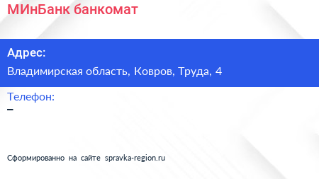 МИнБанк, банкомат по адресу Владимирская область, Ковров, Труда, 4 в дальнейшем Организация, размещена в следующих категориях:
