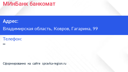 МИнБанк, банкомат по адресу Владимирская область, Ковров, Гагарина, 99 в дальнейшем Организация, размещена в следующих категориях: