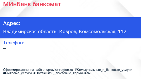 МИнБанк, банкомат по адресу Владимирская область, Ковров, Комсомольская, 112 в дальнейшем Организация, размещена в следующих категориях: