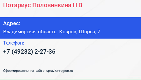 Нотариус Половинкина Н.В. по адресу Владимирская область, Ковров, Щорса, 7 в дальнейшем Организация, размещена в следующих категориях: