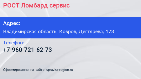 РОСТ Ломбард-сервис по адресу Владимирская область, Ковров, Дегтярёва, 173 в дальнейшем Организация, размещена в следующих категориях: