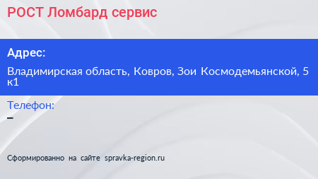 РОСТ Ломбард-сервис по адресу Владимирская область, Ковров, Зои Космодемьянской, 5 к1 в дальнейшем Организация, размещена в следующих категориях:
